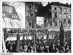 In den ersten Jahren nach 1945 diente der Lustgarten weiterhin als Demonstrationsplatz, den jedoch die SED-Führung als zu klein befand. Zur Erweiterung des Platzes ließ auf Befehl Walter Ulbrichts die Partei im Jahr 1950 das Schloss sprengen und abräumen, wodurch der Lustgarten seine städtebauliche Fassung verlor. Das beschädigte Denkmal Friedrich Wilhelms III. war bereits als Buntmetallschrott eingeschmolzen worden.[8]