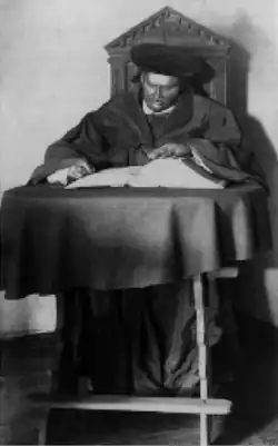 Die Figur war ursprünglich mit Talar und Barett bekleidet und saß, scheinbar schreibend, an einem Tisch, auf dem eine Lutherbibel mit Widmung lag. Kopf und Hände waren aus Wachs. Augenbrauen, Wimpern und Haare waren in dieses Material eingesetzt, die Augen bestanden aus bemalten Glasplättchen. Die Figur war beweglich, so dass ihre Haltung verändert werden konnte.
