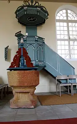 Ältestes Ausstattungsstück ist ein romanischer Taufstein des Bentheimer Typs, der Hinweise auf das Mindestalter der Vorgängerkirche liefert. Er stammt aus der ersten Hälfte des 13. Jahrhunderts.[8] Ein Fragment eines Steinsarkophags stammt möglicherweise aus dem 12. Jahrhundert. Zu den historischen Ausstattungsstücken zählen ferner die Kanzel (1744) und ein Messingkronleuchter (1733).
