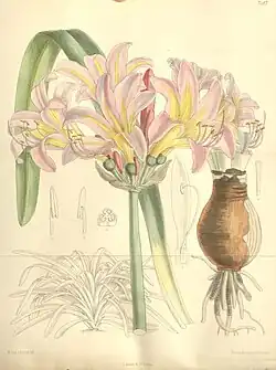 Vier bis acht Blüten stehen in einem endständigen, doldigen Blütenstand mit zwei häutigen Hüllblättern zusammen an einem aufrechten, langen, nicht hohlen Blütenstandsschaft. Die mehr oder weniger aufrechten, zwittrigen Blüten sind fast radiärsymmetrisch bis zygomorph und dreizähligen. Die sechs mehr oder weniger gleichgestaltigen, trompetenförmig verwachsenen Blütenhüllblätter (Tepalen) sind weiß, creme- bis goldfarben, rosa bis leuchtend-rot. Der Rand der Blütenhüllblätter ist manchmal gewellt. Es ist manchmal ein Ring aus sechs Schuppen oder Fäden im Schlund der Blütenröhre vorhanden. Die sechs Staubblätter sind kurz mit den Blütenhüllblättern verwachsen. Drei Fruchtblätter sind zu einem unterständigen Fruchtknoten verwachsen, der wenige Samenanlagen enthält. Der dünne Griffel endet in einer sehr kleinen, kopfigen Narbe.
