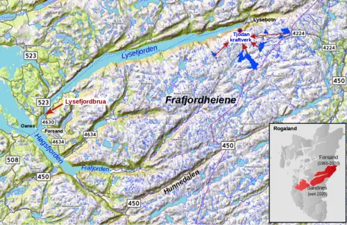 Bis zum Bau der Brücke war der Westteil der ehemaligen Kommune Forsand (seit 2020 Bestandteil der Kommune Sandnes) nur über eine Fähre zwischen den Ortschaften Forsand und Oanes erreichbar, wo Anschluss an die norwegische Reichsstraße 13 (Riksvei 13) bestand. Die einen Großteil der Kommune einnehmende Gebirgslandschaft Frafjordheiene, zwischen dem Lysefjord im Norden, dem Høgsfjord im Westen und dem Frafjord sowie dem Tal Hunnedalen im Süden, ist schwach besiedelt und nur die äußeren Küstenbereiche und angrenzenden Täler durch Straßen erschlossen. In der Kommune Forsand lebten zwar nur etwa 1000 Einwohner, aber schon 1975 gab es erste Bestrebungen zum Bau einer permanenten Straßenanbindung über den Lysefjord. Mit dem Bau des Tjodan-Kraftwerks mit seinen Stauseen im Osten in den 1980er Jahren generierte die Kommune Einnahmen um die Pläne voranzubringen. Die norwegische Straßenverkehrsbehörde Statens vegvesen begann dann 1993 in Zusammenarbeit mit dem Ingenieurbüro Aas-Jakobsen mit der Planung und dem Bau der Lysefjordbrücke, ausführendes Unternehmen war unter anderen AS Betong aus Rogaland. Als finaler Standort wurde eine Engstelle des Fjordes etwa 2,5 Kilometer von der Fährverbindung gewählt; da die Pfeilererrichtung in dem bis zu 500 Meter tiefen Fjord nur am Ufer möglich war, kam als Konstruktion eine Hängebrücke zur Anwendung. Die Kosten einschließlich der Straßenanbindung beliefen sich auf 205 Millionen Norwegische Kronen, wobei sich die Kommune Forsand mit einem Anteil von 62 Millionen NOK beteiligte;[1] die Baukosten der Brücke selbst betrugen 150 Millionen NOK.[2] Nach vier Jahren Bauzeit konnte die Lysefjordbrücke am 18. Dezember 1997 eröffnet werden. Die Fährverbindung Oanes–Forsand–Lauvvik ließ sich danach auf die Strecke über den Høgsfjord zwischen Oanes und Lauvvik verkürzen, verlor aber mit der Verlegung des Riksvei 13 über die neue Route durch den 2019 eröffneten Tunnel Ryfast nach Stavanger an Bedeutung und wurde privatisiert (heute Provinzstraße 523).[3]