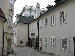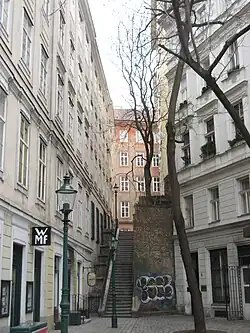 Hier befindet sich die Rückfront des Hauses Mölker Bastei 14, das 1845–1846 von Franz Schlirholz im frühhistoristischen Stil erbaut wurde.