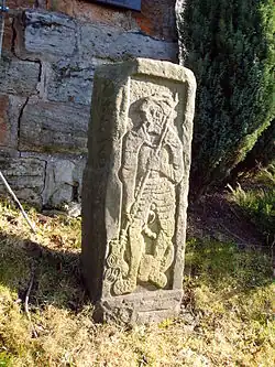 Einer von vier noch vorhandenen dieser Steine wurde im Jahre 1903 vom Manebacher Lehrer Bader in etwa 50 m Entfernung vom Mönchhof am Weg zur Marienquelle entdeckt, zusammen mit Waldwart Frankenberg ausgegraben und zum Mönchhof gebracht. Er wurde im 12. Jahrhundert, vermutlich bald nach der Schenkung, aufgestellt. Die Darstellung ist stark verwittert. Aus älteren Beschreibungen geht hervor, dass es den Heiligen Georg als Relief mit einer Inschrift an der Seite zeigte. Georg trug einen dreieckigen Schild in der linken und eine Lanze in der rechten Hand und war bekleidet mit einem langen, bis an das Knie reichenden Kettenhemd. Über ihm „schwebte“ ein Heiligenschein. Der Stein stand an der Ostwand des Gebäudes, bis er am 13. September 1906 an die heutige Stelle versetzt wurde.