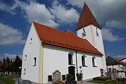Der Vorgängerbau war im Dreißigjährigen Krieg 1643 durch die Schweden niedergebrannt worden. Die Kirche wurde 1656 neu erbaut.[22][23] 1701 wurde der Pfarrhof gebaut und 1707 die Pfarrei mit Ebenried als Filiale errichtet. Die Weihe der Kirche erfolgte um 1735 durch den Eichstätter Weihbischof, die Konsekration 1781. Die Ausstattung ist barock.[24] 1901 kam eine neue Orgel von Edenhofer in Deggendorf in die Kirche; diese wurde 1921 auf 17 m Länge erweitert und bekam 1926 ein neues Geläute von vier Glocken. Die Kirche beherbergt ein mittelalterliches Taufbecken.[25]