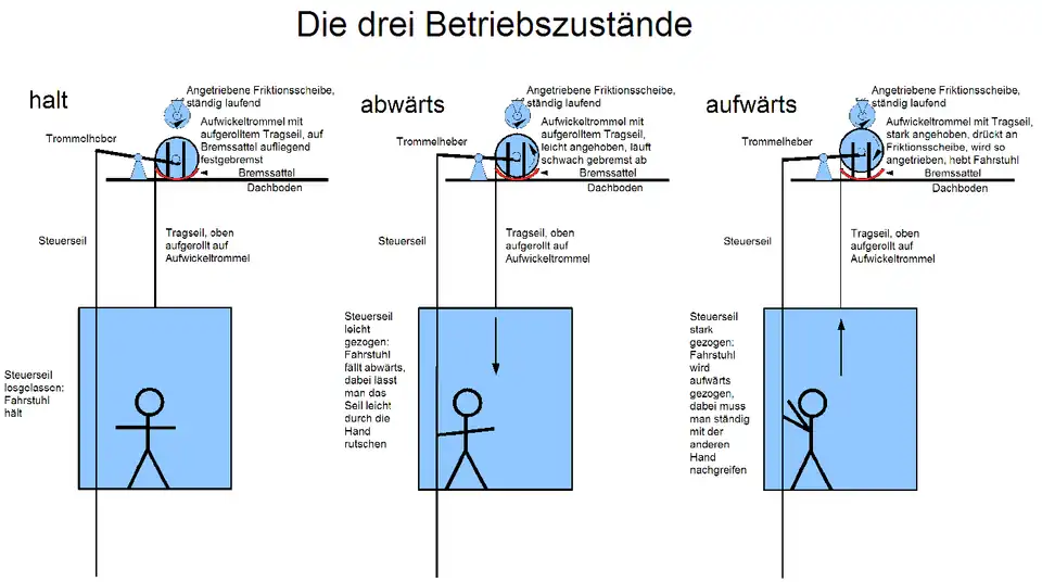 Der Antrieb erfolgt über eine Aufwickeltrommel, die über ein Steuerseil von der Person die den Fahrstuhl benutzt angesteuert wird. Für die Aufwärtsfahrt wird diese an eine laufende Friktionsscheibe gedrückt. Die Aufwickeltrommel wird über Reibung in Bewegung gesetzt und wickelt das Tragseil auf, der Fahrstuhl fährt nach oben. Lässt der Fahrstuhlbenutzer das Steuerseil wieder los, fällt die Aufwickeltrommel wieder in den Bremssattel, die Trommel wird angebremst und der Aufzug steht.