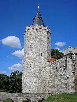 Mittelalterlicher Stadtmauerring mit erhaltenem Wehrgang. Zwischen Frauentor und Rabenturm befand sich ein 17 m langes und 9 m hohes Teilstück der Stadtmauer, das sich alljährlich um 1 cm nach außen neigte. Dieses wird im Jahre 2018 durch Abbau und Wiederaufmauerung erneuert.[54]