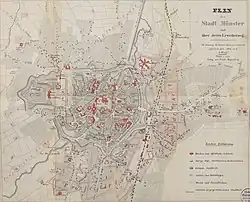 Die Luftangriffe auf Münster im Zuge des Bombenkrieges der Alliierten waren für die Stadt verheerend. Sie war einem Flächenbombardement ausgesetzt und erlitt bis zum Ende des Krieges weit über 100 Angriffe aus der Luft. Der letzte und gleichzeitig zerstörerischste Luftangriff verwüstete am 25. März 1945 die bereits stark in Mitleidenschaft gezogene Altstadt: In einer knappen Viertelstunde, zwischen 10:06 Uhr und 10:22 Uhr, wurden aus 112 schweren Bombern etwa 1800 Spreng- und 150.000 Brandbomben abgeworfen. Mehr als 700 Menschen starben bei diesem Angriff. Dabei wurden 32 US-amerikanische Flugzeuge sowie 22 deutsche Maschinen abgeschossen. Insgesamt sollen im Verlauf des Krieges durch die alliierten Streitkräfte 642.000 Stabbrandbomben, etwa 32.000 Sprengbomben sowie 8000 Kautschuk-Benzolbrandbomben über der Stadt abgeworfen worden sein.[4] Am Abend des Ostermontags, 2. April 1945, wurde Münster von der 17. US-Luftlandedivision und von britischen Panzertruppen kampflos eingenommen. Zu diesem Zeitpunkt lebten nur noch 17 Familien innerhalb des Promenadenrings, also innerhalb der Altstadt.[5] Man kann also sagen, dass die Entscheidung der Bürgerschaft zur Bewahrung der Struktur der Altstadt und zum Wiederaufbau auf der Grundlage der alten Grundstücks- und Straßengrenzen für die Altstadt und ihr Aussehen maßgeblich war.