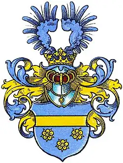 Blasonierung: In Blau ein goldener Balken, darunter drei (2:1) goldene Rosen. Auf dem gekrönten Helm mit blau-goldenen Helmdecken ein offener blauer Flug.[2]