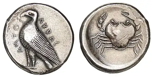 Auf den Münzen von Akragas erscheint fast immer ein Adler auf der Vorderseite (Avers) und eine Krabbe auf der Rückseite (Revers). Diese Kombination der Münzbilder wurde im Verlauf des 5. Jahrhunderts zwar durch einige Symbole ergänzt und in Details abgeändert, galt jedoch seit dem Beginn ihrer Münzprägung ca. 525–510 v. Chr. bis zu ihrer Einstellung um das Jahr 406 v. Chr. als kontinuierliches Erkennungszeichen der Polis.[8] Im Gegensatz zur Münzprägung von Selinunt, welche zu Beginn mit einem vertieften Quadrat noch kein figürliches Bild auf den Rückseiten zeigte, startete Akragas unmittelbar mit dem Bild der Krabbe auf dem Revers. Dieses Vorgehen könnte von den korinthischen Geprägen übernommen worden sein, die auf Sizilien bereits weiträumig zirkulierten. Wissenschaftliche Analysen der sizilischen Hortfunde sowie akragantinische Überprägungen korinthischer Münzen belegen solch einen Einfluss, welcher von dem griechischen Festland ausging.[9]