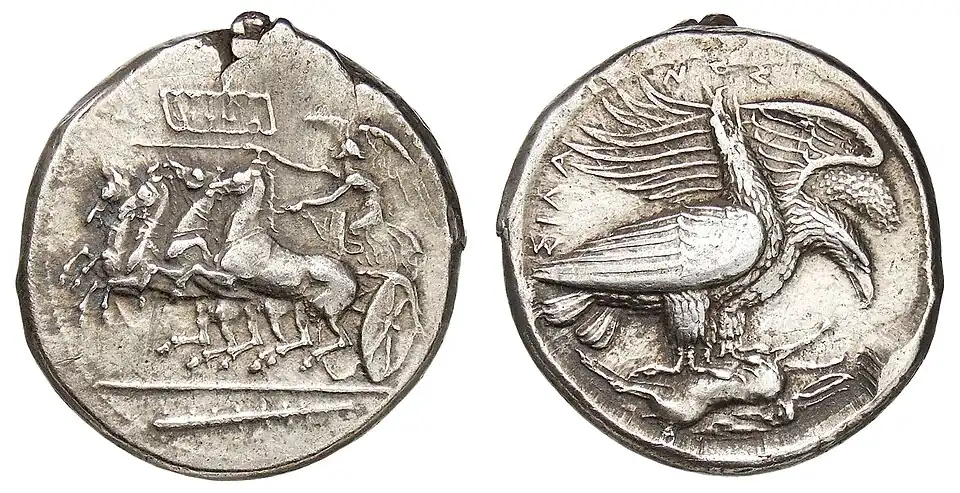 Die Münzprägung von Akragas im letzten Viertel des 5. Jahrhunderts v. Chr. (Periode III) zeichnet sich durch zahlreiche neue Darstellungsvarianten aus. So wurde der Vogel nun auch mit weit ausgebreiteten Flügeln und gefangener Beute zwischen den Klauen beim Landen präsentiert, wobei diese Beute unter anderem aus Hasen, Schlangen oder Fischen bestand. Eine Weiterentwicklung hiervon war das jagende Adlerpaar, bei dem zwei Vögel über einem erlegten Hasen standen.[19] Gegen Ende der akragantinischen Prägetätigkeit am Ende des 5. Jh. v. Chr. wurde dieses Motiv kurzzeitig auf den Revers versetzt, während auf dem Avers eine Quadriga dargestellt wurde. Die motivische Übernahme der Quadriga gilt als Beleg für den Einfluss von Syrakus im späten 5. Jahrhundert auf gesamt Sizilien.[20]