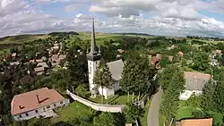 - Im Gemeindezentrum die reformierte Kirche,[6] wurde vor dem Mongolensturm von 1241 errichtet und gilt als die älteste reformierte Kirche im Klausenburger Gebiet. Im 15. Jahrhundert wurde auf der Westseite ein Narthex mit zwei Türmen angebaut. 1442 wurden die romanische Apsis durch gotische ersetzt. An der Südseite des Turms sind kleine Steinfiguren angebracht. Die Decke und Bänke der Kirche[7] wurden von der sächsischen Tischler- und Malerfamilie Umling aus Saschiz, um 1753 oder 1758 angefertigt.[3] Die Kirche steht unter Denkmalschutz.[4]
