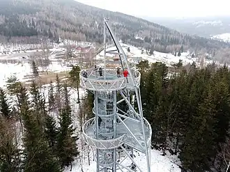 Der Gipfel ist fast vollständig mit Nadelwald bewachsen. Einige km vom Gipfel verläuft die polnisch-tschechische Grenze. Auf dem Gipfel befindet sich ein 2022 eröffneter Aussichtsturm mit ca. 15 Meter Höhe.