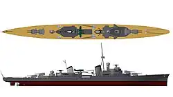 - ↑ BA-MA-RM-20-1913; Allgemeine Typfragen für Schlachtschiffe, Panzerschiffe und Kreuzer 1939-40; Amt für Kriegsschiffbau B.Nr. A V 308/39 g.Kds.; Berlin 5.Mai. 1939.
