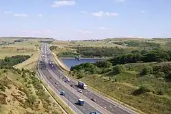 | Der M62 bei der Anschlussstelle 22 in den Pennines am höchsten Punkt | ||||||||||||||||||||||||||||||||||||||||||||||||||||||||||||||||||||||||||||||||||||||||||||||||||||||||||||||||||||||||||||||||||||||||||||||||||||||||||