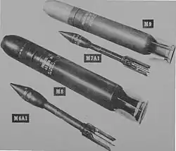 Für die Rakete musste ein neuer Zünder, der M4, konstruiert werden, da der Zünder eines Artilleriegeschosses nicht genutzt werden konnte. Bei Artilleriegeschossen basiert das Scharfstellen des Zünders (Vorrohrsicherung) auf Prinzip des Dralls und der Längsbeschleunigung; bei der leitflächenstabilisierten M8 konnte hingegen nur die Längsbeschleunigung genutzt werden.[26] Das Scharfstellen erfolgt in zwei Schritten; erstens musste der Zünder beim Raketenstart eine Vorwärtsbeschleunigung erfahren, dann musste diese Beschleunigung nach dem Ausbrennen des Triebwerks enden. Die Treibladungsstäbe waren ungefähr 26 Meter nach dem Start verbrannt. Die Absicht hierfür bestand darin, dass keine versehentliche Zündung vor dem Start und während der kurzen Beschleunigungsphase geschah.[27] Der Zünder wurde allerdings bei einer relativ geringen Beschleunigung von 100 g scharfgestellt, was vergleichbar wenig gegenüber einem Artilleriegeschoss (etwa 20.000 g) oder Mörsergranate (etwa 4.000 g) ist. Sobald der Sicherungsstift des Zünders gezogen wurde, durften deshalb beim Beladen des Startrohres keine großen Erschütterungen stattfinden.[28] Der Aufschlagzünder konnte auf sofortige oder eine verzögerte (0,1 s) Zündung eingestellt werden.[29] Bei sofortiger Zündung erfolgte die Explosion an der Oberfläche; Druckwelle und Splitter verteilte sich in einem großen Umkreis. Bei verzögerter Zündung drang die Rakete in das Ziel ein oder es wurde ein tiefer Explosionskrater gebildet.