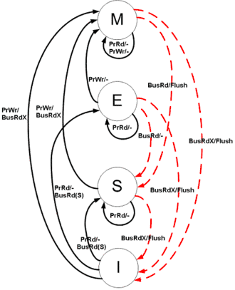 Die Lese- und Schreiboperationen sowie die dadurch direkt und indirekt erzeugten Bustransaktionen legen das Verhalten des Zustandsautomaten fest, der durch das MESI-Protokoll definiert ist (siehe Abbildung).