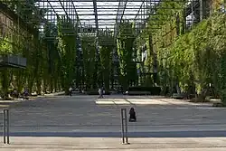 Mit der Anlage des Parks auf dem 0,9 ha grossen Grundstück wurde 2001 begonnen; er wurde 2002 eröffnet. Der zweite Teil des Gestaltungskonzepts, ein der offenen Hallenseite vorgelagerter Platz mit berankten Stelen, ist noch nicht ausgeführt. Das hierfür zum Abbruch bestimmte viergeschossige Backsteingebäude wird vorderhand weiter genutzt.[1]