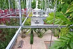 Der Park durchläuft ausdrucksstarke jahreszeitliche Phasen: Im Winter tritt die Konstruktion des Traggerüsts mit den Rankhilfen zutage, die im Verlauf der Vegetationsperiode unter blühenden und grünen Schichten verschwindet. Im Herbst leuchtet der Park im Rot des Wilden Weins.