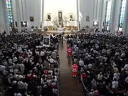 Innenansicht der Klosterkirche; auf dem linken Seitenaltar befindet sich der Schrein der Seligen