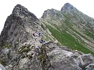 - ▬ Der rot markierte Höhenweg Orla Perć vom Bergpass Zawrat über den Gipfel auf den Bergpass Krzyżne. Als Ausgangspunkt für eine Besteigung des Höhenwegs eignen sich die Berghütten Schronisko PTTK Murowaniec sowie Schronisko PTTK w Dolinie Pięciu Stawów Polskich.