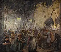 Mabel May wurde 1918 von Eric Brown, dem Direktor der National Gallery of Canada, der zusammen mit Sir Edmund Walker aktiv an der Beschäftigung kanadischer Künstler für den Canadian War Memorials Fund beteiligt war, eingeladen, ein Gemälde für die Heimatfront zu malen. Sie erhielt die Erlaubnis, in den Werkstätten der Canadian Pacific Railway in Angus und der Northern Electric zu zeichnen. Das 1919 entstandene Gemälde zeigt, was eine Fabrikarbeiterin damals als eine Allee von ratternden, schleifenden und rasselnden Maschinen beschrieb.[3]