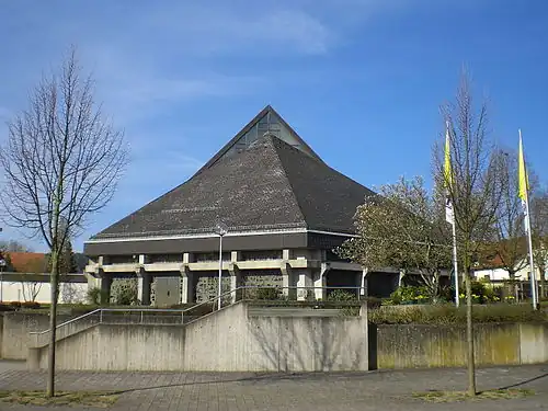 Die evangelische Mätthäus-Kirche – fertiggestellt 1956 – befindet sich für Maberzell auf dem Trätzhof.
