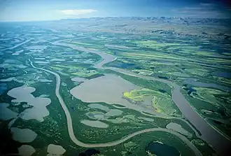 Mackenziedelta mit seinen zahlreichen Seen und Flussarmen. Im Vordergrund hat der East Channel während der Hochwasserperiode ein Reversed Delta in einen See abgelagert.