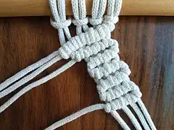 Ein Makrameemuster, das entsteht, wenn ein und derselbe Knoten in vertikaler Richtung mehr- oder vielfach wiederholt wird, nennt man Platting (engl. sennit, sinnet).[107][108][109]