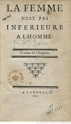 Einige Literaturwissenschaftler hingegen vertreten die Hypothese, dass Mary Wortley Montagu die initiale Verfasserin der Schrift sei, die pseudonym unter dem Titel Woman Not Inferior to Man (1739)[31] geschrieben worden war und dass der französische Text nur eine Übersetzung sei. Die Schrift wird ihrerseits Montagu zugeschrieben.[32][33][34] Bekannt ist in diesem Zusammenhang, dass sich ihr Ehemann Philippe-Florent de Puisieux als Autor zahlreicher Übersetzungen aus dem Englischen präsentierte. Was in Beziehung zu einer weiteren Vermutung steht, ob nicht ihr zukünftiger Ehemann bei den Übersetzungen der endgültigen Veröffentlichung geholfen habe.