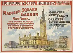 Barnum eröffnete am 30. April 1874 „The New York Hippodrome“, den späteren Madison Square Garden. Es war das größte Gebäude für Vergnügungen, das jemals gebaut worden war, und hatte mehr als 10.000 Sitzplätze. Die Baukosten beliefen sich auf 150.000 US-Dollar. Die aufwändigen Produktionen, die im Hippodrome gezeigt wurden, setzten den Maßstab für die zukünftigen, spektakulären und erstklassigen Vorstellungen, die mit dem Namen Barnum verbunden wurden.[2] 1875 mietete Patrick S. Gilmore, ein bekannter Kapellmeister, der das Lied When Johnny Comes Marching Home komponierte, das Gebäude von Barnum und nannte es „Gilmore’s Garden“.[3] Der Landschaftsgärtner John Thornhall pflanzte Farne und Bäume und ließ Fontänen anlegen – wie in einem Garten, denn das Haus hatte kein Dach. Er sorgte sogar dafür, dass Strom gelegt wurde.[4] Es fanden verschiedene sportliche Aktivitäten statt wie Fechten, Gewichtheben, Jonglieren mit Keulen und Kanonenkugeln, Ringen und Radfahren, wie eine Zeichnung belegt. Eine Gravur zeigt die Fahrer auf einer Holzbahn mit Zuschauern auf einer offenen Tribüne, an und außerhalb der Bahn sowie Leute, die an Tischen sitzen und eine Kapelle innerhalb der Bahn. Schließlich wurde „Gilmore’s Garden“ von William Henry Vanderbilt nach dem nahe gelegenen Platz bzw. Park in „Madison Square Garden“ umbenannt und am 31. Mai 1879 wieder eröffnet. Hier sollten ursprünglich Bahn-Rad-Rennen stattfinden. Am 12. Februar 1879 wurde die erste Kunsteisbahn in Nordamerika im Garden eröffnet. Der Garden war ohne Dach, heiß im Sommer und eiskalt im Winter.