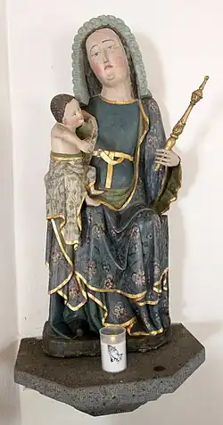 Die circa einen Meter hohe und wohl später farbig gefasste Holzskulptur mit der sitzenden Maria und dem Jesuskind an ihrer rechten Seite könnte um 1400 entstanden sein. Die Kopfkrause spricht für den Anfang des 15. Jahrhunderts.