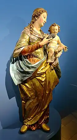 Die aus Holz geschnitzte, farbig gefasste Standfigur hat mit einer Höhe von etwa 170–175 cm Lebensgröße. Der Jesusknabe sitzt auf dem linken Arm der Mutter und greift mit der rechten Hand nach einer blauen Weintraube, die sie ihm reicht. Die Weinbeeren, aus denen der Saft quillt, gelten als Symbol des Blutes Christi am Kreuz und in der Eucharistie. Beim Bildtyp der Traubenmadonna hat die scheinbar idyllische Handlung zwischen Mutter und Kind diesen ernsten Hintergrund.