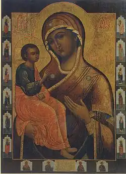 Das Tafelbild hat eine Grüße von 4,30 × 2,10 × 0,6 m, wiegt 8 Doppelzentner[24] und besteht aus zwei großen Holztafeln, die durch Querstäbe auf der Rückseite zusammengehalten werden. Das Holzstück, auf dem der Kopf der Hodegetria gemalt ist, ist eiförmig mit einer maximalen Größe von 1 m × 85 cm und einer graduellen Dicke von unten nach oben von 2 bis 5 cm, so dass das Gesicht der Madonna eine leichte Neigung nach vorne hat.[25]