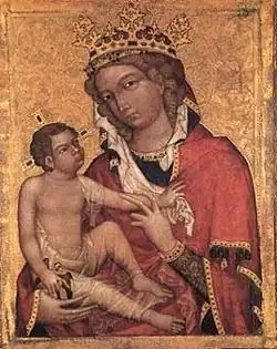 Die Farbgebung ist stark von christlicher Symbolik geprägt, der in königlichem Rot gehaltene Mantel weist zusammen mit der Krone auf Maria als Königin hin, der blau, als Zeichen für Glaube und Himmel, unterfüttert ist (in strenger byzantinischer Ikonografie wäre ein blaues Kleid gemalt, hier nimmt sich der mittelalterliche Künstler seine Freiheit). Das weiße Tuch symbolisiert körperliche und geistige Reinheit. Vom Typus her als Maria Hodegetria ausgeführt, wird Christus aber nicht nur zur Anbetung präsentiert, sondern steht die zärtliche Beziehung der Mutter zu ihrem Sohn ebenso im Fokus des Malers. Der Distelfink in der Hand des Knaben weist auf das kommende Leiden Christi hin, der rote Kopf des Vogels ist einer Legende nach vom Blut Jesu getränkt, als er einen Dorn aus der Dornenkrone des Leidenden riss. Im Gold des Hintergrunds wird symbolisch das Neue Jerusalem vorweggenommen. Anders als in der strengen byzantinischen Ikonografie wurde bei der Ausführung auf eine Vorzeichnung der Konturen verzichtet, ebenso sind die Umrisse vergleichsweise wenig betont.
