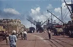 ![]() Gut zu erkennen ist das Mehrschienengleis Hafen von Madras, vermutlich um 1950. Gut zu erkennen ist das Mehrschienengleis | |