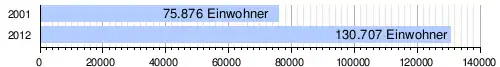 Im urbanen Gemeindegebiet lebten bei der Volkszählung 2012 25.928 Einwohner in 4025 Haushalten,[1] bei der Volkszählung 2001 17.776 in 2947 Haushalten[12] und bei der Volkszählung 1988 11.135 in 2120 Haushalten.[13] Bei der Volkszählung 1977 waren es 7856 Einwohner.[14]