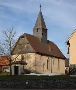 Die kleine spätgotische Saalkirche aus verputzten Bruchsteinen ist mit einem Krüppelwalmdach bedeckt, aus dessen Mitte sich ein schiefergedeckter Dachreiter erhebt, der mit einem Pyramidendach bedeckt ist. Der Bau wurde 1880 stark verändert. Aus dieser Zeit stammen die hohen spitzbogigen Fenster und die Emporen an drei Seiten, die auf Stützen aus Gusseisen aufliegen. Die ursprünglichen Gewölbe wurden herausgenommen und durch eine Flachdecke ersetzt, die von zwei gusseisernen Unterzügen getragen wird. Das Taufbecken trägt eine Datierung aus dem Jahr 1662, ein Kruzifix stammt aus dem 18. Jahrhundert. Die Orgel wurde 1878 gebaut.