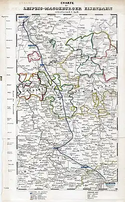Der Baubeginn erfolgte am 24. Januar 1838. Erstmals in der deutschen Eisenbahngeschichte war zu berücksichtigen, dass die Strecke mehrere Länder berührte: neben den Königreichen Preußen (Magdeburg, Halle) und Sachsen (Leipzig) durchquerte sie auch das Herzogtum Anhalt-Köthen. Die Strecke wurde von Preußen am 13. November 1837, von Anhalt am 18. September 1840 konzessioniert.[2]