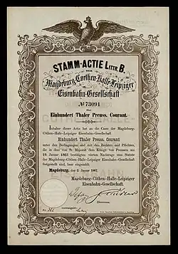 Erst nachdem offenbar wurde, dass sich die Entwicklung des Eisenbahnwesens nicht aufhalten ließ, beantragte die Magdeburger Kaufmannschaft am 22. Mai 1835 die Gründung einer Eisenbahn-Aktiengesellschaft, die ihre Konzession von der preußischen Regierung jedoch erst im November 1837 erhielt. Der Magdeburger Oberbürgermeister Francke, beeindruckt von der Aktienzeichnung für die Leipzig-Dresdner Eisenbahn, beabsichtigte ursprünglich, die Strecke nicht über Halle, sondern über Brehna laufen zu lassen.[1] Dadurch sollte die Verbindung schneller werden, allerdings wurde dieser Vorschlag abgelehnt, nachdem Vertreter der Stadt Halle interveniert hatten.