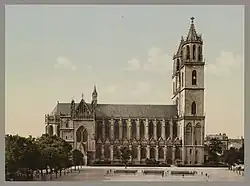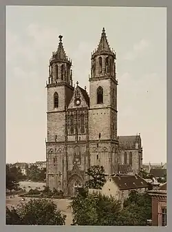 Der Dom St. Mauritius und St. Katharina zu Magdeburg, kurz Magdeburger Dom, ist Predigtkirche des Landesbischofs der Evangelischen Kirche in Mitteldeutschland, evangelische Pfarrkirche und zugleich das Wahrzeichen der Stadt Magdeburg. Der Dom ist die erste von Anfang an gotisch konzipierte und die am frühesten fertiggestellte Kathedrale der Gotik auf deutschem Boden sowie der größte Sakralbau Mitteldeutschlands.[1] Er wurde ab 1209 als Kathedrale des Erzbistums Magdeburg gebaut, im Jahr 1363 geweiht und 1520 fertiggestellt (Vollendung der Westtürme). Eine erste Kathedrale wurde 1207 bei einem Stadtbrand stark zerstört. Deren Ursprünge gehen auf eine Klostergründung im Jahr 937 zurück, die Klosterkirche wurde ab 955 erweitert und 968 zur Kathedrale erhoben.[2] Der Dom ist Grabkirche Ottos des Großen und seiner ersten Gemahlin Editha. Nach schweren Beschädigungen durch alliierte Luftangriffe auf Magdeburg 1944/1945 und Restaurierung nach dem Krieg wurde der Dom 1955 wieder eröffnet. Er befindet sich im Eigentum der 1994 vom Land Sachsen-Anhalt gegründeten Kulturstiftung Sachsen-Anhalt.