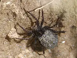 Einige Zeit danach fertigt das Weibchen einen Eikokon an, der wie bei allen Wolfspinnen von diesem an den Spinnwarzen angeheftet transportiert wird. Die Jungspinnen klettern nach dem Schlupf auf das Opisthosoma der Mutter (das ist eine weitere Eigenart bei allen Wolfspinnen) und lassen sich von dieser einige Zeit tragen, ehe sie sich von dieser trennen. Die Jungspinnen überwintern und erlangen im Folgejahr die Geschlechtsreife.