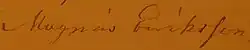 - ↑ Johannis Evangelium. Är det en äkta apostolisk bok och är dess lära: att Gud är vorden menniska, en sann och kristlig lära? En Religiös-Dogmatisk Historisk-Kritisk Undersökning, Stockholm 1864 (= Magnús Eiríksson: Er Johannes-Evangeliet et apostolisk og ægte Evangelium og er dets Lære om Guds Menneskevorden en sand og christelig Lære? En religiøs-dogmatisk, historisk-kritisk Undersøgelse, Kopenhagen 1863) sowie Läran om dopet, Stockholm 1865 (= Magnús Eiríksson: Hvem har Ret: Grundtvigianerne eller deres Modstandere? Kopenhagen 1863).