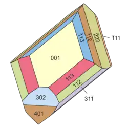 | Häufige Kristallflächen | {302}, {401}, {112}, {113}, {111}, {112}, {223}, {331}[3] |