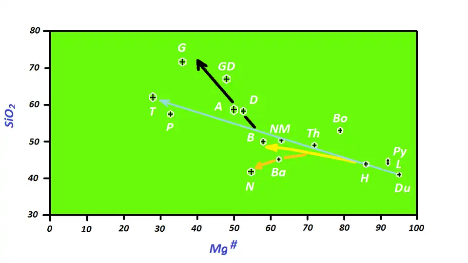 Beim Aufschmelzvorgang von magmatischen Gesteinen wird die Magnesiumzahl Mg# nicht oder nur unwesentlich verändert. Jedoch hat die daran sich anschließende fraktionierte Kristallisation, insbesondere von Olivin, sowie eine eventuelle Krustenkontamination, auf sie einen entscheidenden Einfluss.