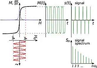Das Bild illustriert die Signalentstehung. Die schwarze Kurve ist die Magnetisierungskurve der Eisenoxidpartikel. Durch die geringen Abmessungen dieser Teilchen tritt keine Hysterese auf. Dies wird auch als Superparamagnetismus bezeichnet. Die rote Kurve illustriert das Aussteuerungsfeld als Funktion der Zeit. Dieses bringt die Eisenoxidpartikel mit hoher Frequenz in magnetische Sättigung, um sie gleich wieder zu entmagnetisieren. Die grüne Kurve in der Mitte der Grafik veranschaulicht die Magnetisierung der Eisenoxidpartikel als Funktion der Zeit. Diese Funktion ist nun nicht mehr rein sinusförmig. Gleichwohl muss diese Funktion periodisch sein mit der Frequenz des Aussteuerungsfeldes. Sie lässt sich folglich als Fourier-Reihe schreiben, wobei die Grundfrequenz diejenige des Aussteuerungsfeldes ist. Die Harmonischen sind ein Maß für die Konzentration der Eisenoxidpartikel.