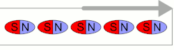 Legt man an ferromagnetisches Material ein äußeres magnetisches Feld an, so richten sich die Weissschen Bezirke gleich aus. Durch das Drehen der Dipole ändert sich die Länge eines Stabes im Bereich von ca. 10 bis 30 µm/m (hochmagnetostriktive Werkstoffe: bis 2 mm/m).[4] Durch ein magnetisches Wechselfeld wird jeder ferromagnetische Stoff, beispielsweise der Eisenkern eines Transformators, zu mechanischen Schwingungen angeregt. Durch Magnetostriktion an ferromagnetischen Materialien (z. B. in Spulenkernen) in sich ändernden Magnetfeldern kann es zu Geräuschen kommen – ähnlich wie es durch Elektrostriktion in einem sich stark ändernden elektrischen Feld an einem Dielektrikum (z. B. in einem Kondensator) zu Geräuschen kommen kann.[5] Diese physikalische Reaktion eines ferromagnetischen Materials beruht auf dem Vorhandensein von magnetischen Bewegungen, im Wesentlichen einer Ansammlung winziger Dauermagneten oder magnetischen Bereichen. Jeder Bereich besteht aus vielen Atomen. Wenn ein Material nicht magnetisiert ist, sind die Bereiche zufällig angeordnet. Wird das Material magnetisiert, werden die Bereiche so ausgerichtet, dass ihre Achsen ungefähr parallel zueinander verlaufen, und die Größe oder Form wird verändert. Die Wechselwirkung eines äußeren Magnetfeldes mit den Bereichen verursacht ebenfalls den magnetostriktiven Effekt. Die Anordnung der Bereiche und damit das Ausmaß des Effekts kann durch die Wahl der Legierung, das thermische Glühen, die Kaltbearbeitung und die Stärke des Magnetfelds beeinflusst werden.[6]