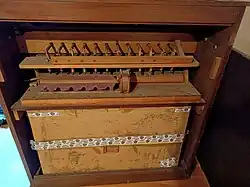 Die „Forte I“- und „Forte II“-Register variieren die Lautstärke von Bass und Diskant über eingebaute Klappen. Das ist dynamisch auch über zwei Kniehebel möglich, die sich unterhalb des Manuals befinden.