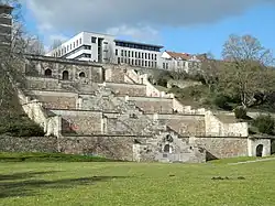 Ursprünglich befand sich auf dem Gelände ein Terrassengarten. Die vorhandenen Treppen und Stützmauern wurden renoviert. Auf der oberen Terrasse wurde eine Grotte zur Aufnahme einer Plastik von Hans Sautter installiert. Dargestellt ist ein athletischer junger Mann, der nackt in eine Decke eingeschlagen ist. Er liegt auf dem Rücken, sein Gesicht ist starr auf das Gewölbe gerichtet. Die Decke ist im Bereich des Oberkörpers einseitig zurückgeschlagen, auch die Füße liegen bloß.