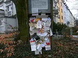 Verliebte oder verlassene Menschen heften an der Pinnwand auf Zetteln Botschaften und Wünsche ab. Textbeispiele: „Wir bleiben immer zusammen“, „In Liebe und großer Verbundenheit“, „gib mir die Liebe meines Lebens zurück“. Der Eigentümer des Grundstücks betreut die Buche und die Pinnwand.[1]