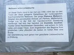 Auf dem Grundstück stand von 1795 bis 1845 das Gartenhaus der Hamburger Kaufmannsfamilie Maiboom. In der Hamburger Franzosenzeit trafen sich hier heimlich Clemens Maiboom, Mitglied des Patriotischen Kreises, und Clothilde Gauthier, Tochter eines französischen Gesandten. Die beiden pflanzten in hohem Alter diese Buche als Symbol für ihre Liebe.